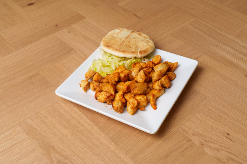 Chicken doner cut off the rotisserie. Served with doner bread.